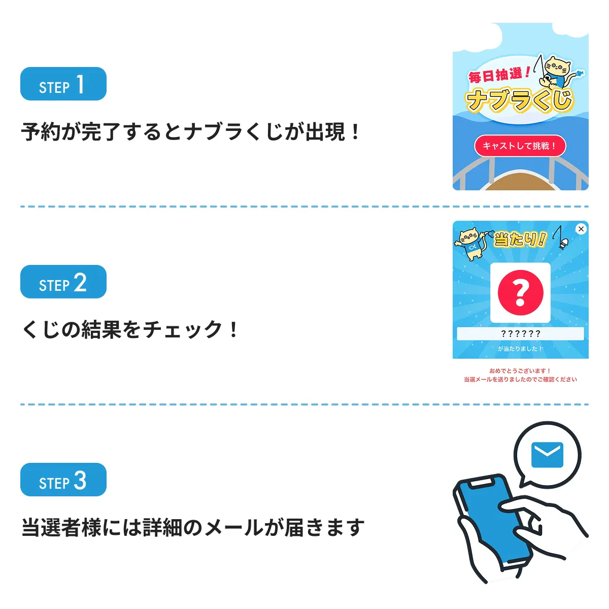 ・お一人さま1予約につき1回までチャレンジできます。(同一人物による複数回のキャンセル・予約の繰り返しが発覚した場合、当選を無効にさせていただく場合がありますのでご注意ください。)