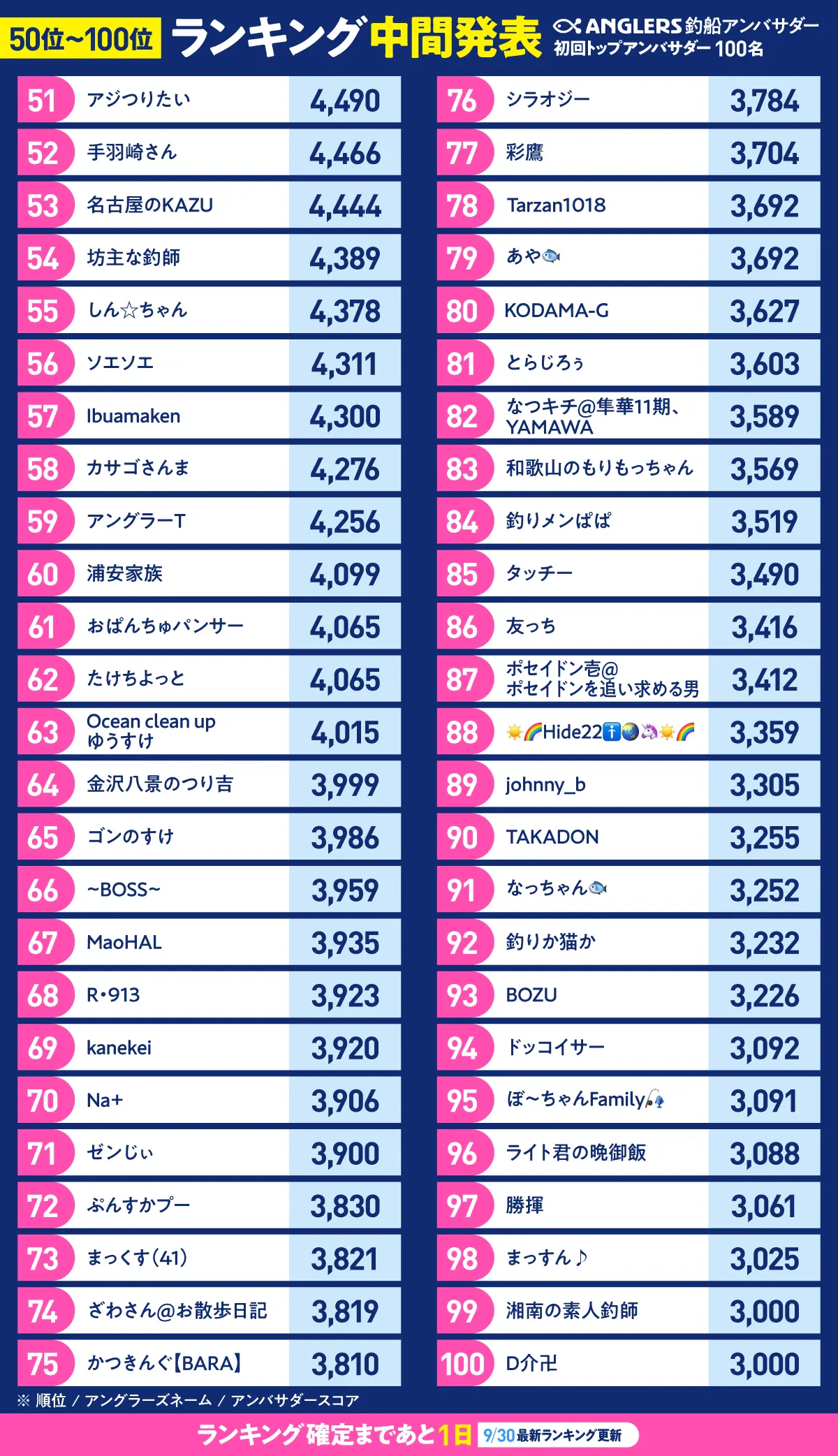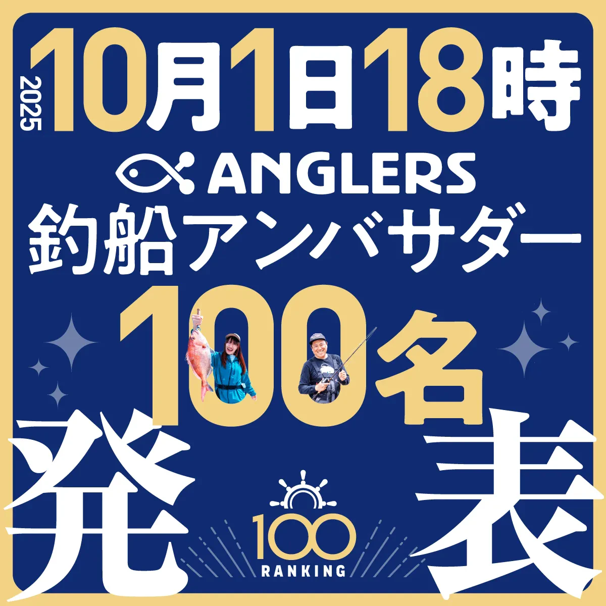 ANGLERS釣船アンバサダーのうち、ランキング上位100名の初回トップアンバサダーを、2025年10月1日(水)18時に特設サイトにて公開予定!