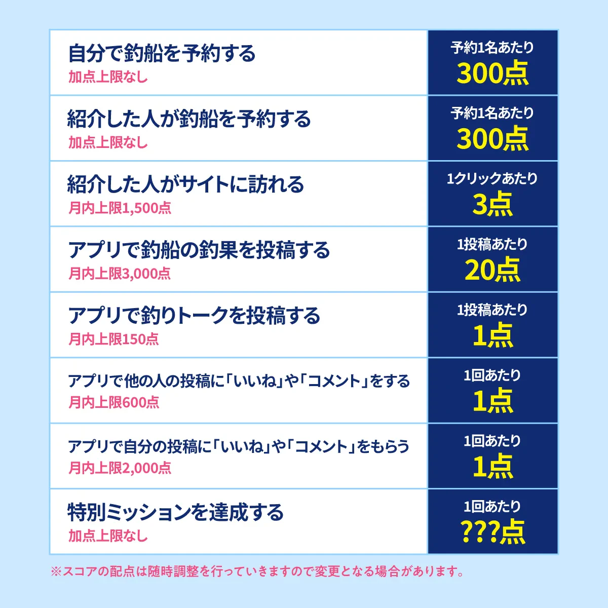 アングラーズ釣船予約からの予約であれば予約1名について300点のスコアを獲得。