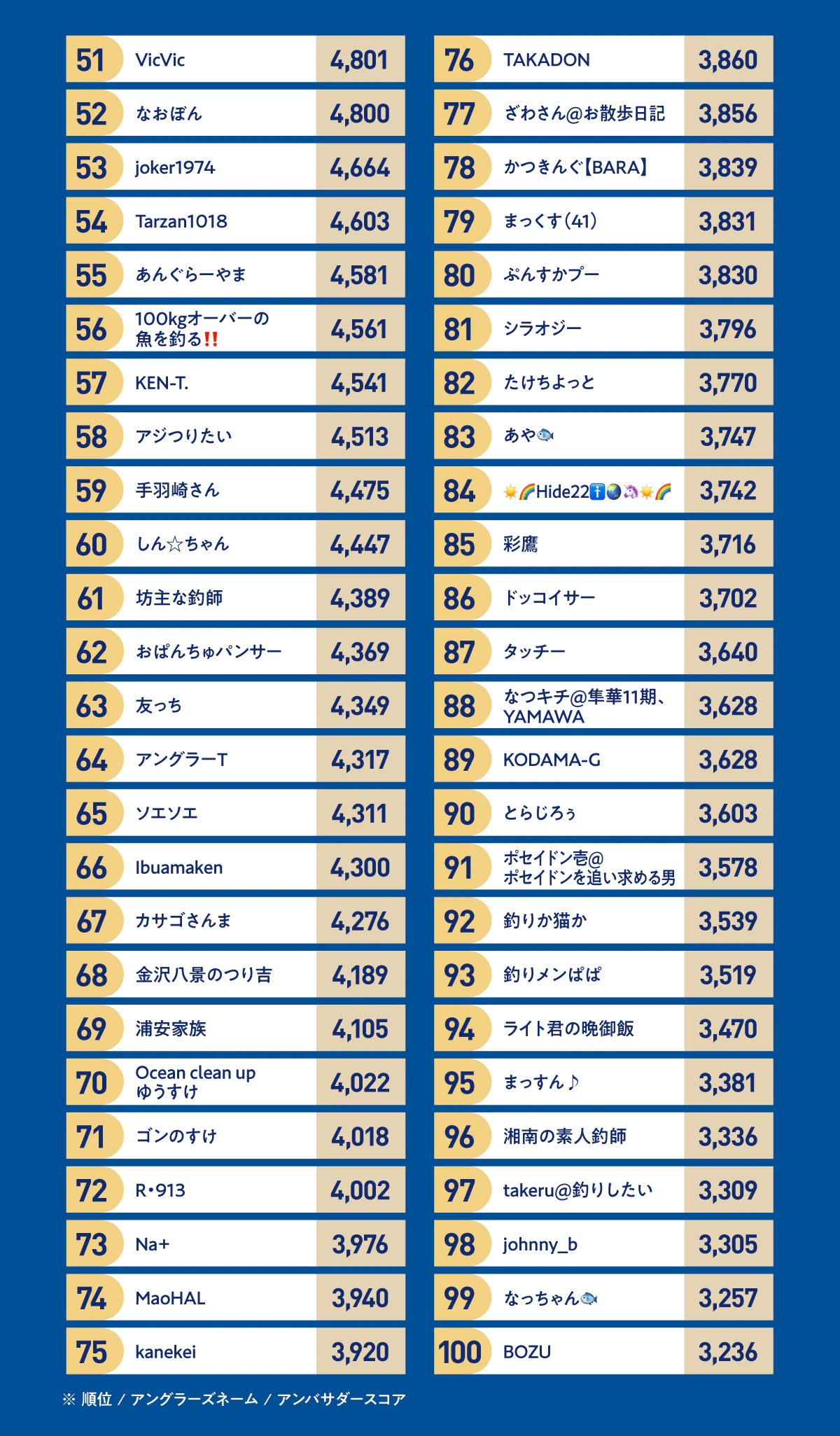 トップアンバサダーのうちランキング上位10名が10万円分の釣行サポート、11位〜100位の方は順位応じた支援内容を受け取ることができます。