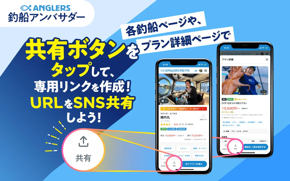 アングラーズ釣船予約にログインした状態で、船ページやプランページ下部の「共有」ボタンをタップ