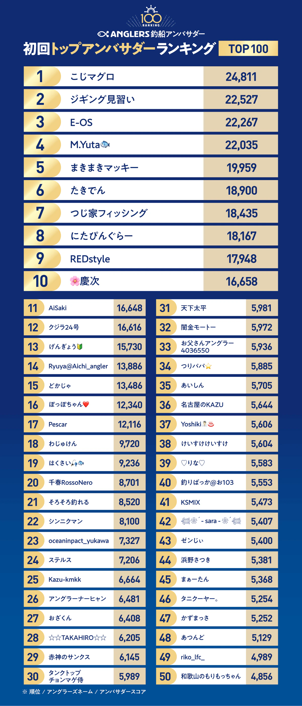 船釣りのアンバサダーとして釣り業界を盛り上げてくれるトップアンバサダー100名が決定しました。