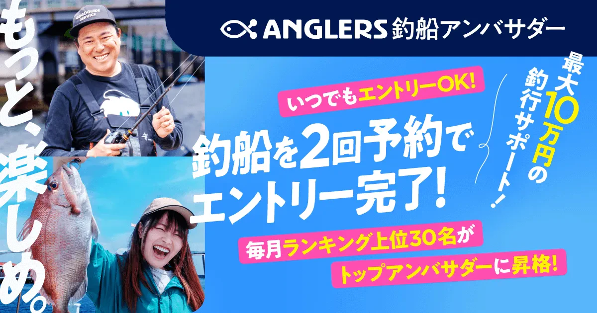 『ANGLERS釣船アンバサダー』はもっと船釣りを楽しみたい全釣り人を対象に、毎月最大10万円分の釣行サポートを行う企画です。