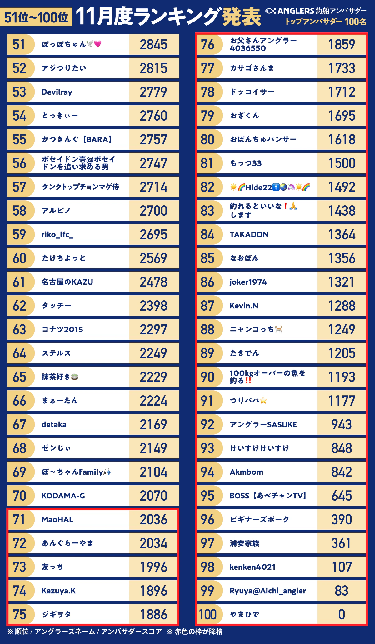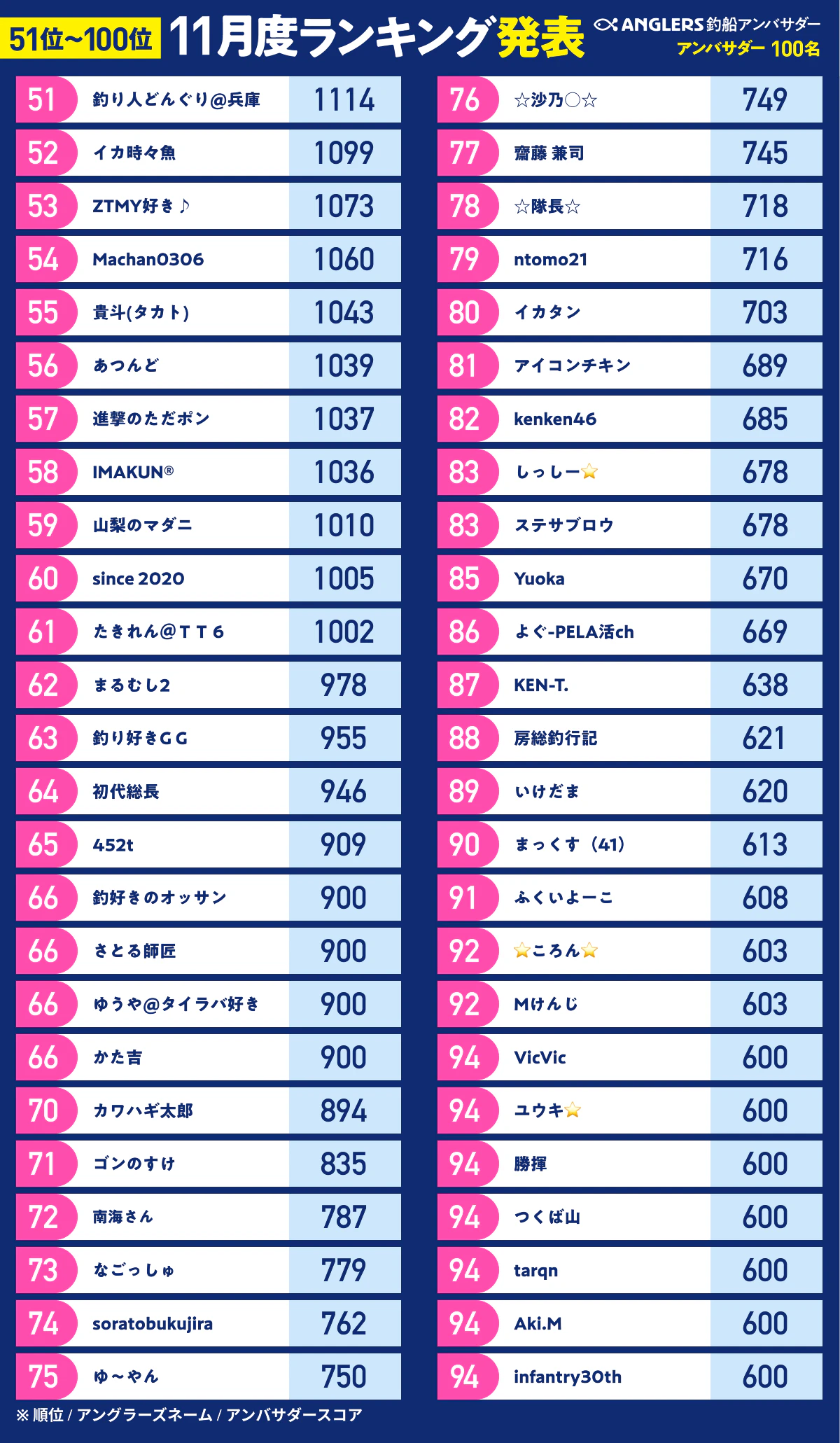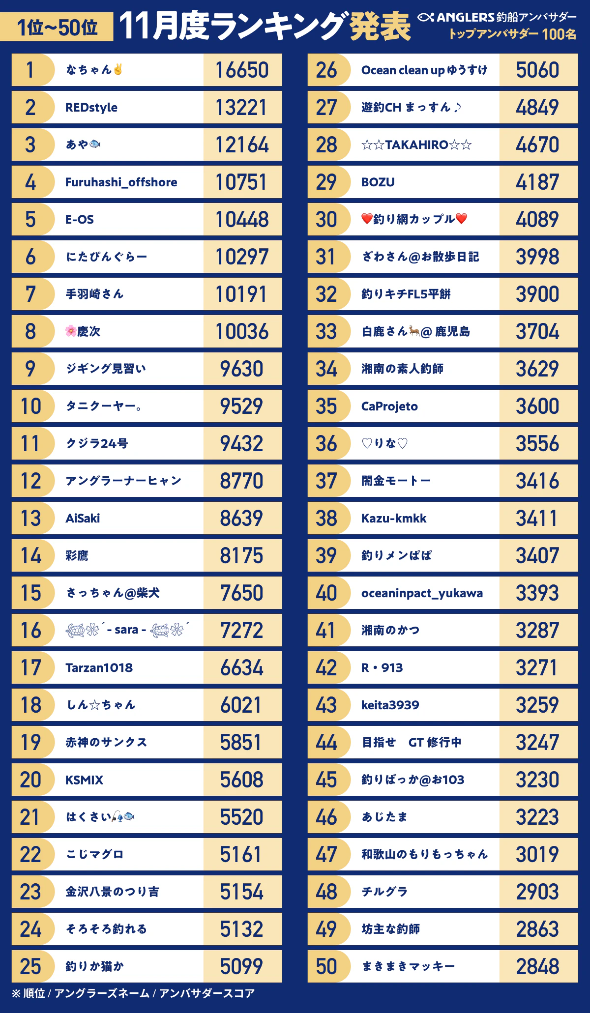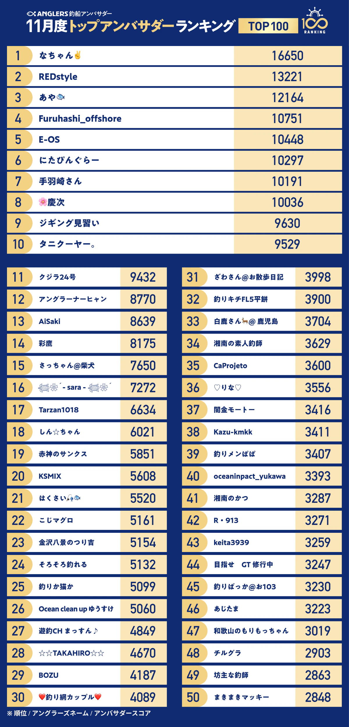 トップアンバサダーのうち、ランキング上位10名には10万ポイントを付与、11位〜100位の方には順位に応じたANGLERSポイントを付与いたします。