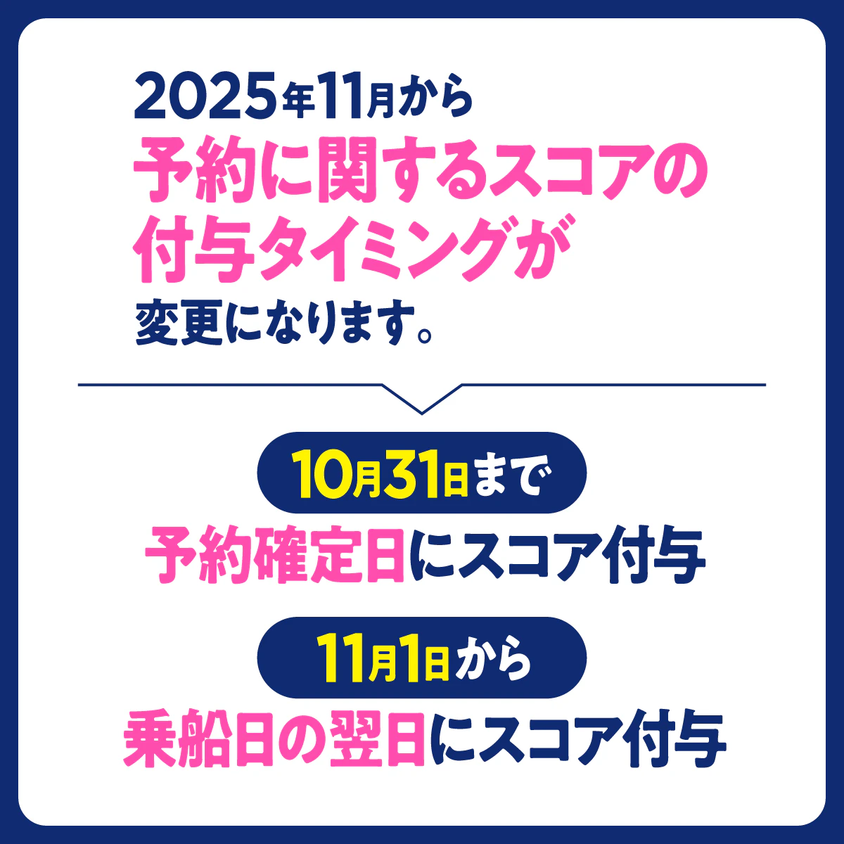 ・2025年11月1日以降の乗船は、過去のどの時点で予約したものであってもスコアの対象となります。