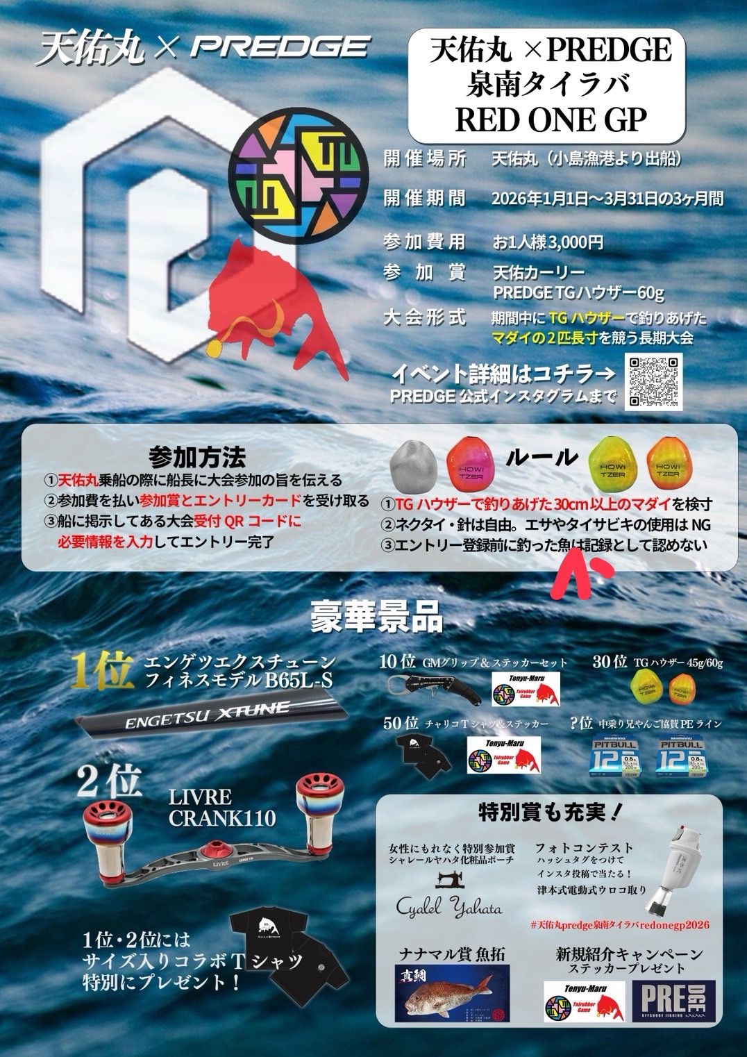 小島漁港より出船し、周辺海域で真鯛の長寸を競う大会プランです。 ⚠️予約状況及び大会の詳細については、公式ブログにてご確認ください。